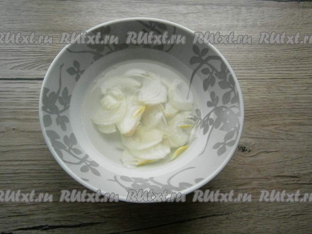 Очищенный лук нарезать тонкими полукольцами и залить на 10 минут кипятком.