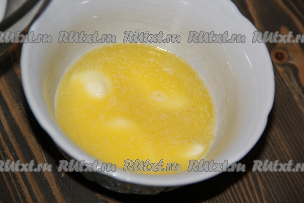 Прежде всего замесим тесто для хвороста. Для этого сливочное масло нужно растопить, дать немного остыть.