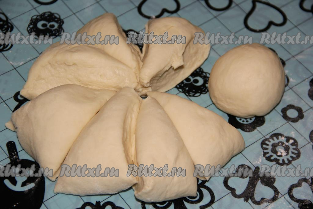 Тесто выложить на рабочую поверхность, припылённую мукой, и разделить тесто на 8 частей.