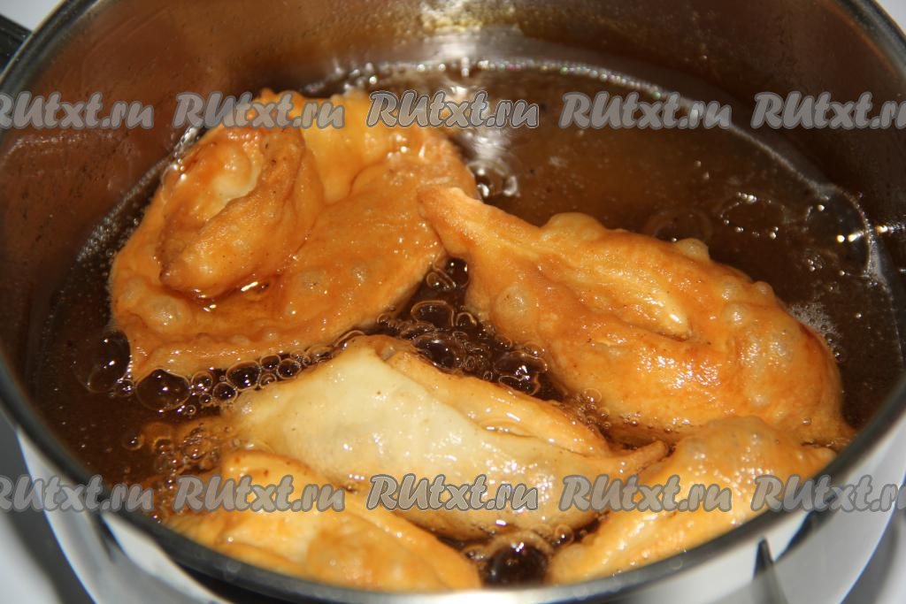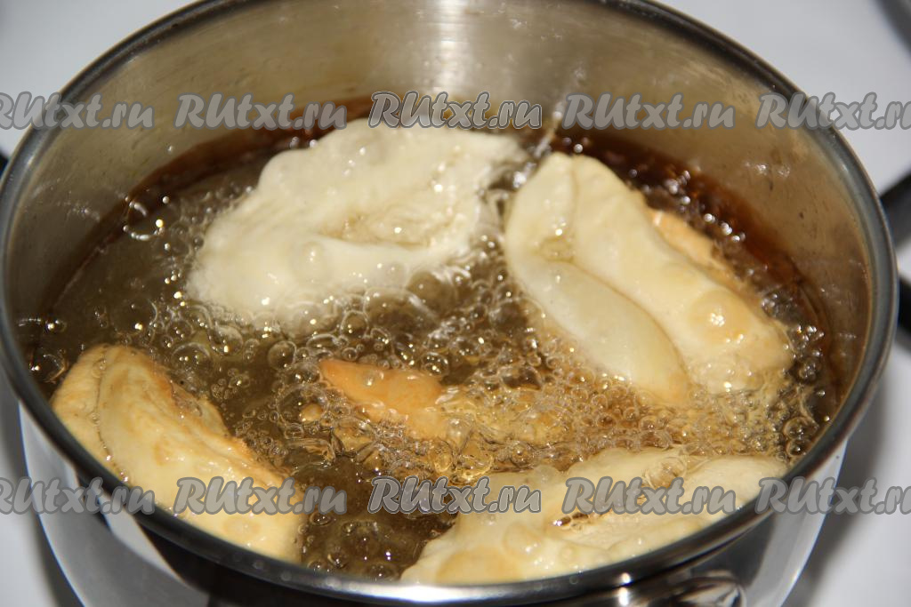 В глубокой сковороде (или в кастрюле) хорошо разогреть растительное масло, аккуратно опустить несколько кусочков нарезанного теста. Масла должно быть достаточно много, оно должно доходить до середины хвороста.