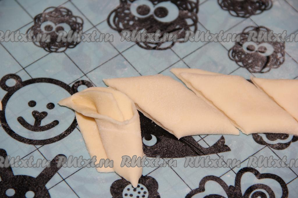 Затем разрезать наискосок полоску из теста на кусочки шириной, примерно, 3-4 сантиметра. Благодаря тому, что тесто припыляли мукой, слои теста должны отделяться друг от друга, как на фото. Разделить концы каждого кусочка теста, получится заготовка, чем-то напоминающая цветок, благодаря этому хворост получится особенно аппетитным, да и медовым сиропом в дальнейшем пропитываться он будет хорошо.