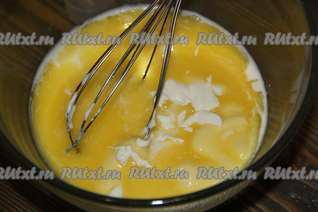 В глубокой миске соединить молоко, сметану и не горячее растопленное масло, слегка перемешать массу венчиком.