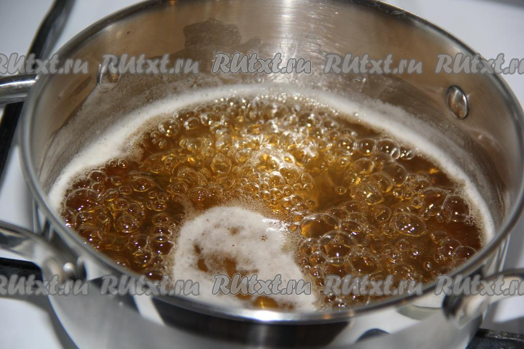 Поставить кастрюлю на огонь и, помешивая, довести медовый сироп до кипения, затем варить, периодически перемешивая, на небольшом огне 3 минуты (до полного растворения сахара и мёда). Убрать кастрюлю с медовым сиропом с огня.