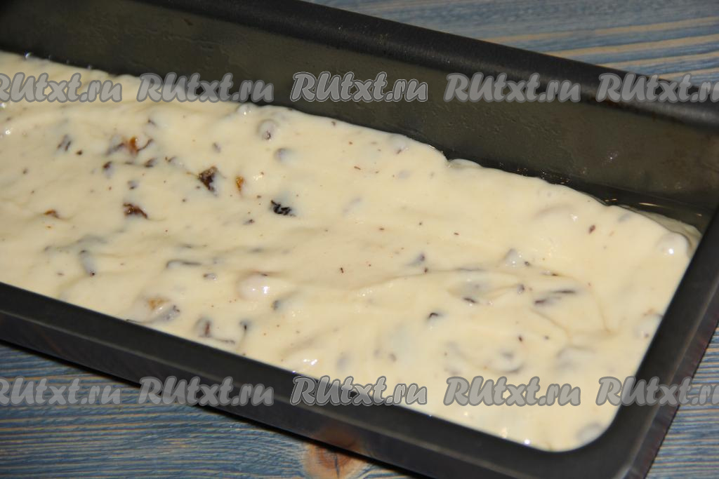 Бока и дно формы для выпечки кексов (я взяла металлическую форму размером 32х12 сантиметров) смазать растительным маслом. Выложить тесто в подготовленную форму и разровнять. Кекс, замешанный на кефире с сухофруктами, выпекать в разогретой до 180 градусов духовке минут 40-45 (до готовности выпечки). Для того чтобы убедиться в готовности, нужно проколоть кекс сверху сухой зубочисткой, если после прокалывания выпечки зубочистка останется сухой, без следов теста, значит кекс полностью готов.