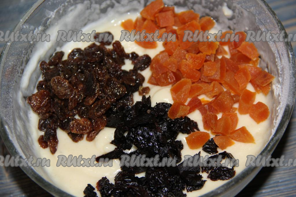 Если вы используете крупные сухофрукты (например, курагу и чернослив), тогда их нужно нарезать на более мелкие кусочки. Добавить сухофрукты в тесто и аккуратно перемешать лопаткой, равномерно распределяя сухофрукты по всему тесту.