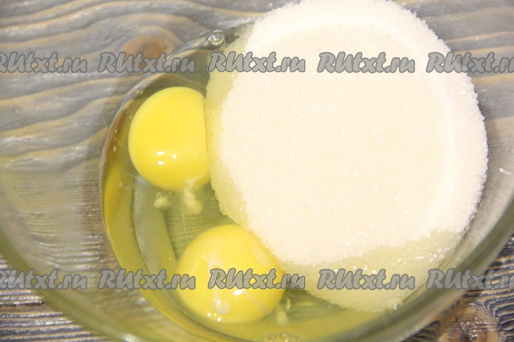 Яйца с сахаром взбивать миксером на максимальных оборотах в течение 5 минут. В результате взбивания яичная масса станет светлой и пышной, сахар полностью растворится.