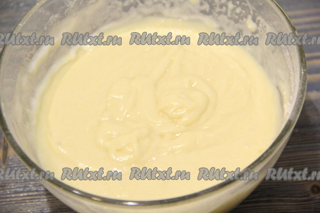 Постепенно подсыпая в тесто оставшуюся муку и каждый раз полностью вмешивая её лопаткой, замесить однородное тесто, напоминающее по консистенции сметану средней густоты.