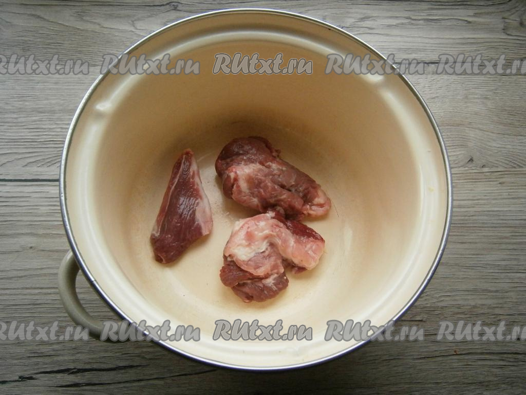 Мясо, выложив в кастрюлю, залить водой и отправить на огонь. После закипания снять пену, снизить огонь к минимуму, посолить и варить свинину 30-40 минут.