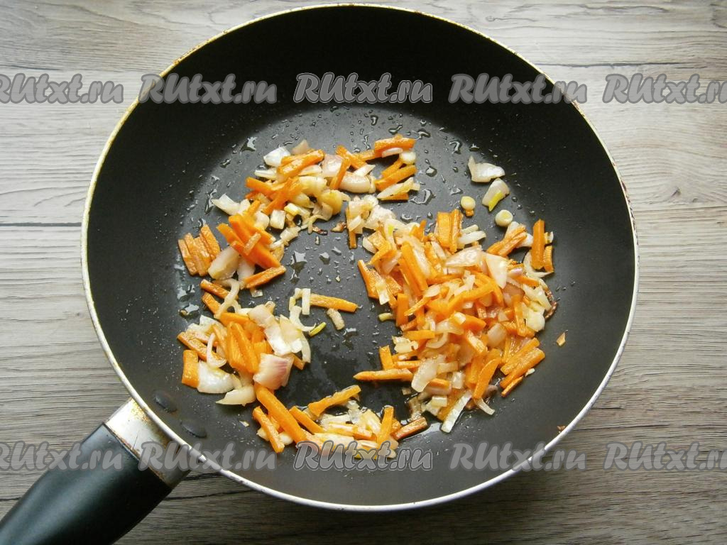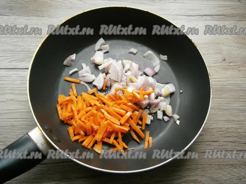 Обжаривать лук с морковью, помешивая, в течение 5 минут.