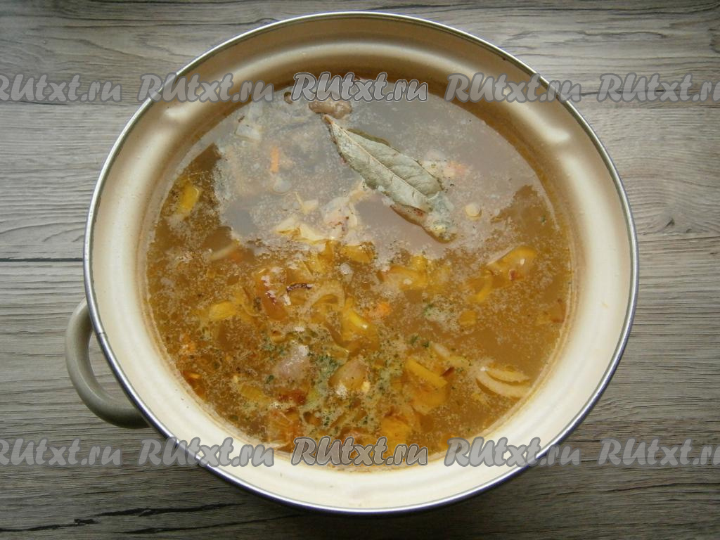 Когда картошка будет практически готова, отправить в кастрюлю обжаренные овощи, всыпать приправу для супа, добавить лавровый лист и измельченный чеснок, варить суп на небольшом огне еще минут 10.
