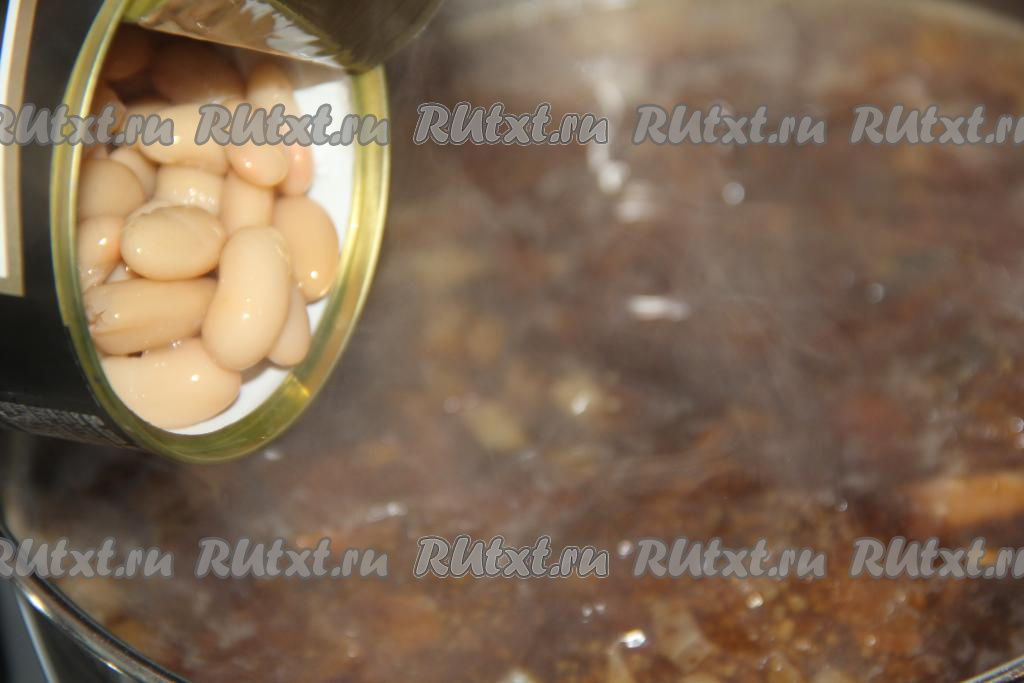 Подготовить продукты для супа. Фасоль можно взять белую или красную. Если готовите с сухой фасолью, то её нужно предварительно залить холодной водой и оставить на ночь, затем залить чистой водой и варить до готовности (от 40 минут до 1,5 часов - продолжительность варки зависит от сорта фасоли). Фасоль должна стать мягкой, но при этом не развариться. Я готовила с консервированной фасолью.