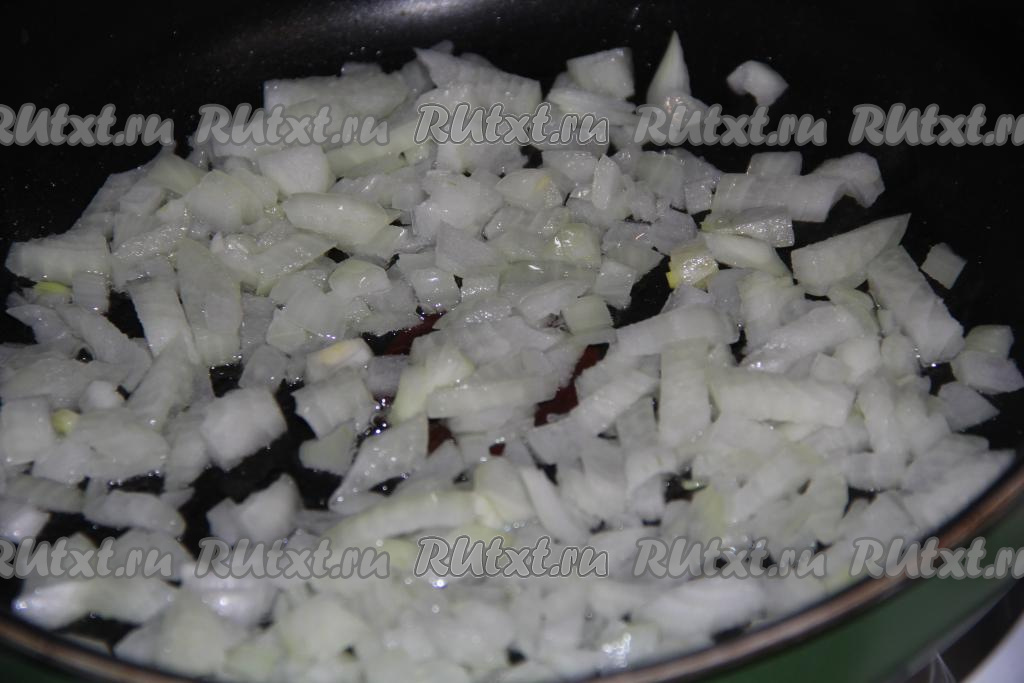 Лук очистить и мелко нарезать. Выложить лук в сковороду и добавить 1 столовую ложку растительного масла. Обжарить лук до золотистого цвета, иногда помешивая.