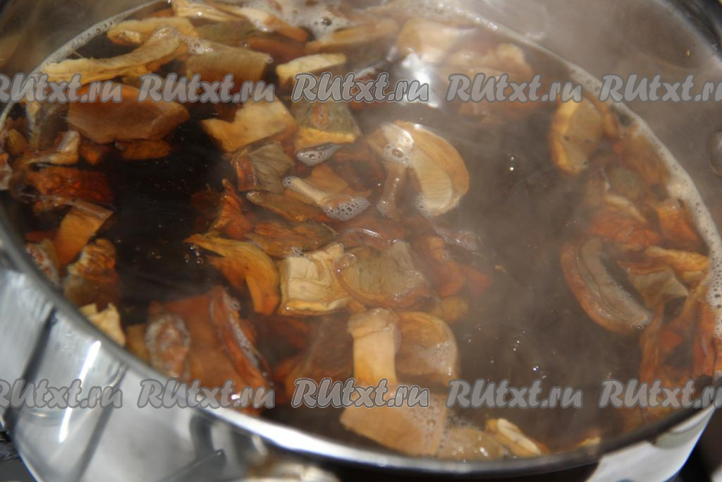 В кастрюлю влить грибной настой, добавить 1 литр воды и выложить нарезанные грибы. Поставить кастрюлю на огонь, довести до кипения и, убавив огонь, варить сушеные грибы в течение 35 минут.