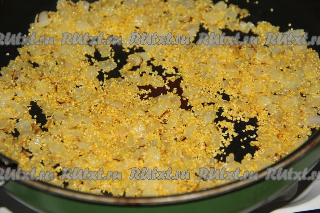 Обжарить крупу с луком на небольшом огне в течение 3 минут, помешивая.