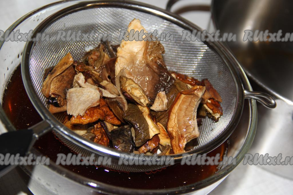 Затем откинуть грибы на дуршлаг и процедить грибной настой. Грибы нарезать на небольшие кусочки.