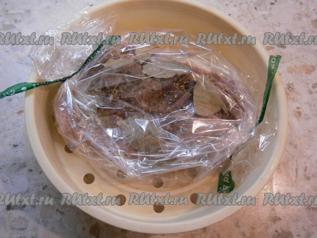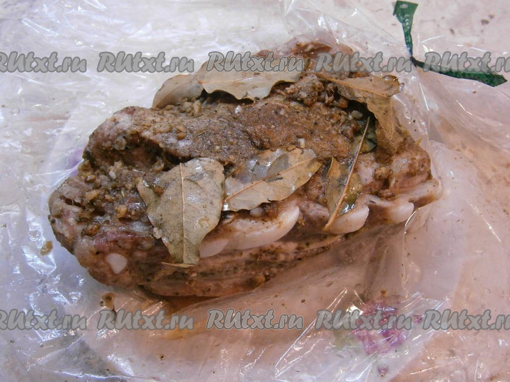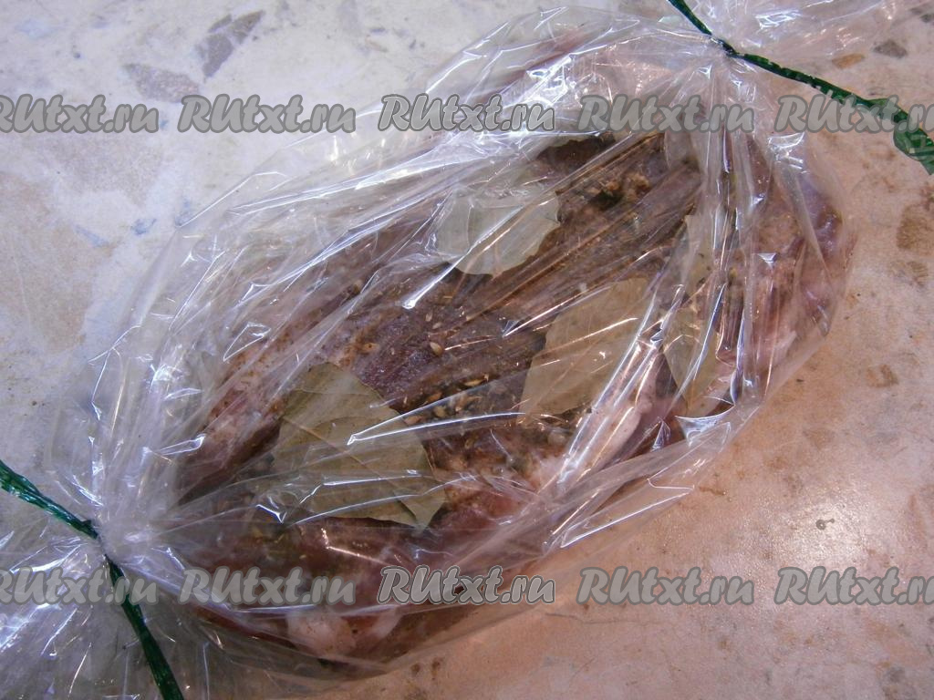 Поместить грудинку в пакет для запекания, сверху разместить лавровые листья. Края пакета тщательно завязать.