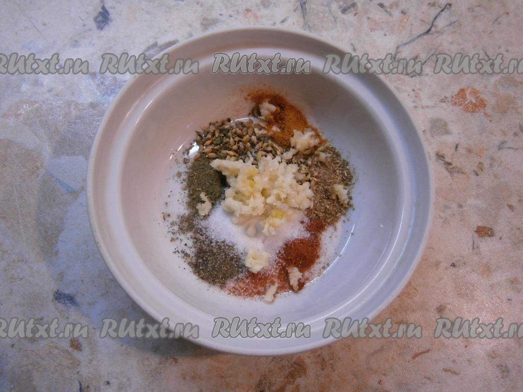 К специям и соли добавить пропущенный через пресс чеснок, перемешать.