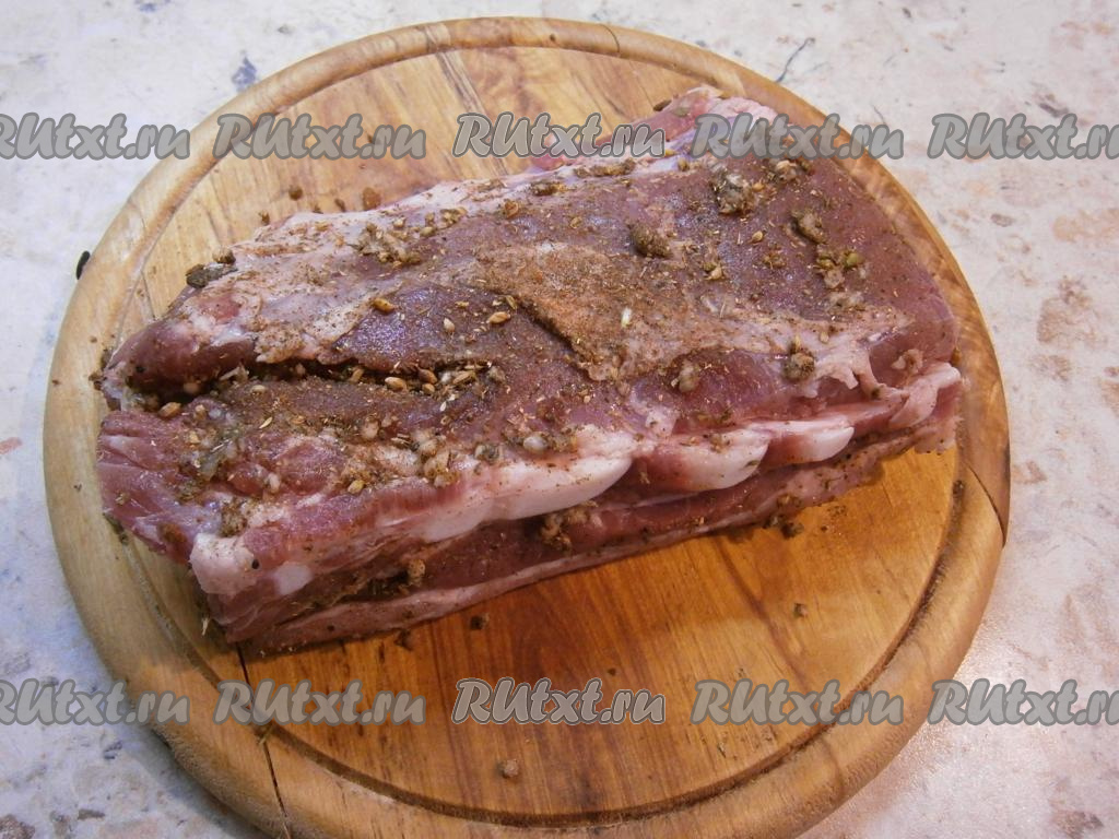Натереть подготовленной пряной смесью свиную грудинку со всех сторон.