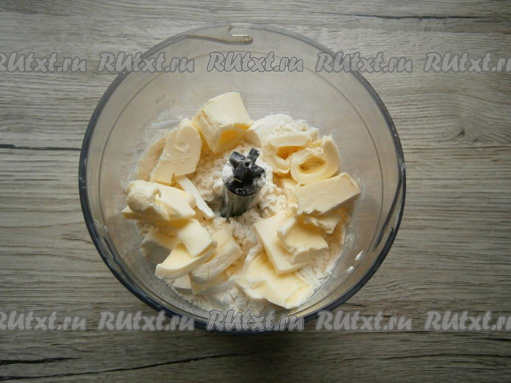В чашу блендера или комбайна всыпать 1 стакан муки, добавить нарезанное кусочками холодное сливочное масло, щепотку соли.