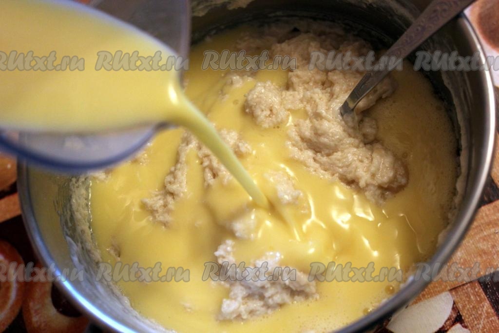 Влейте взбитые яйца и взбейте всё вместе до образования однородного пышного теста.