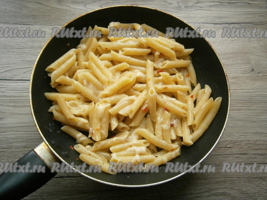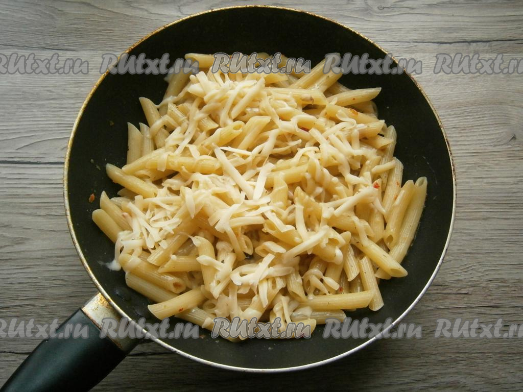 Накрыть сковороду крышкой, огонь сделать минимальным. Готовить макароны до готовности - от 7 до 15 минут (обязательно смотрите инструкцию на упаковке). Перемешивать макароны в процессе варки не нужно. Когда выкипит вся жидкость, добавить к макаронам натертый на терке твердый сыр.