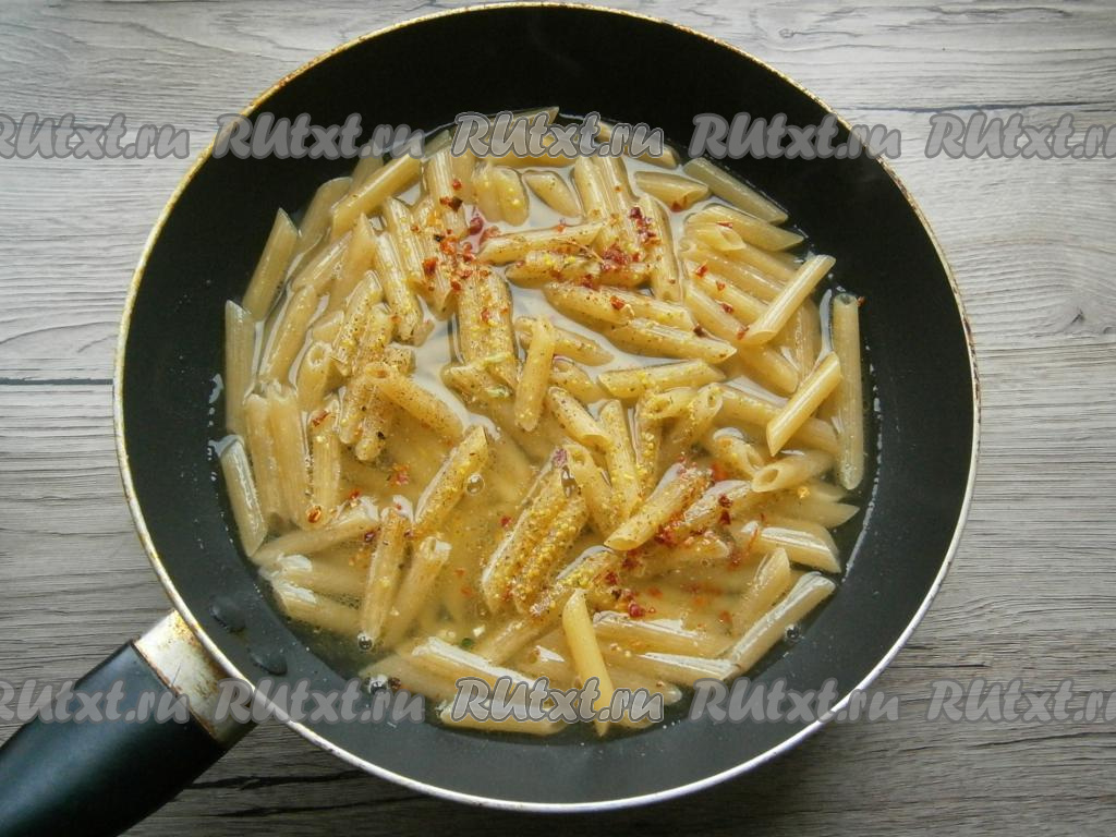 Всыпать в сковороду сухие макароны, перемешать и обжарить с маслом в течение 1-2 минут на среднем огне, помешивая.