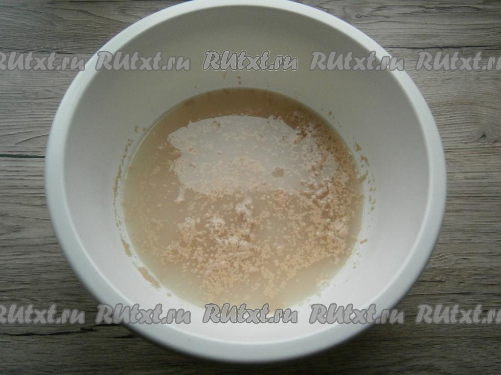 Воду подогреть до 38-40 градусов, влить в достаточно объёмную миску, всыпать дрожжи, тщательно перемешать. Если температура воды будет больше 42 градусов, дрожжи в ней могут погибнуть, а значит тесто не поднимется
