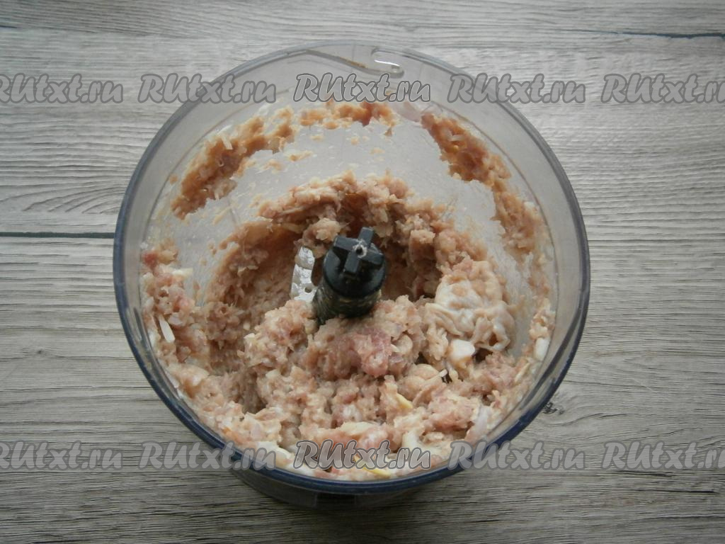 Измельчить мясо с луком до состояния крупномолотого фарша.