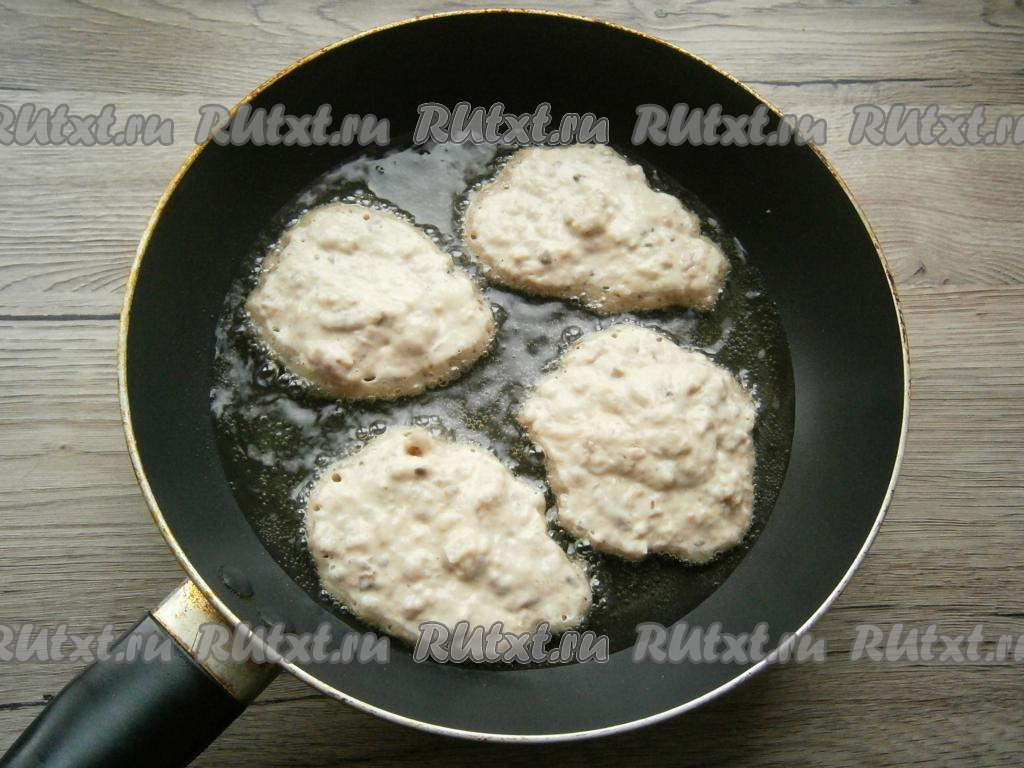 Далее столовой ложкой выкладывать тесто на разогретую с растительным маслом сковороду в виде оладий.