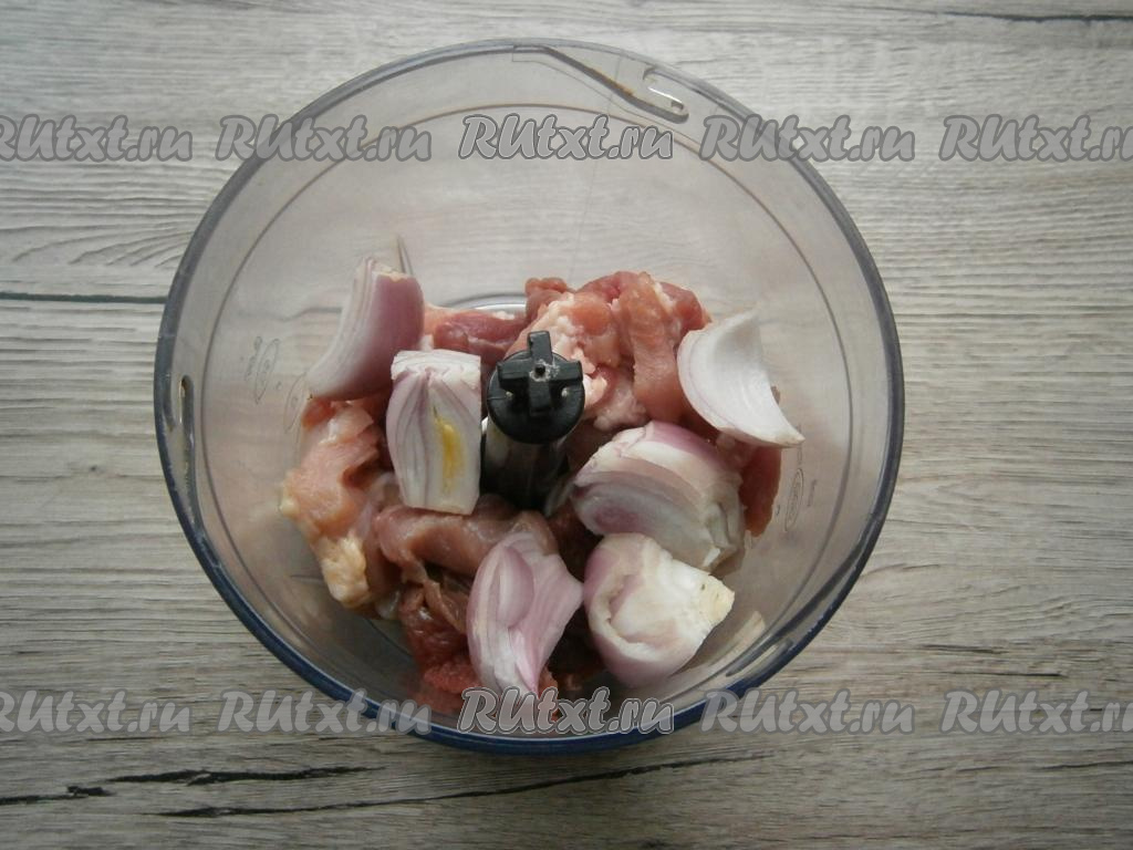 Мясо нарезать кусочками, поместить в чашу блендера вместе с 1 очищенной луковицей, нарезанной кусочками (мясо с луком можно пропустить и через мясорубку).