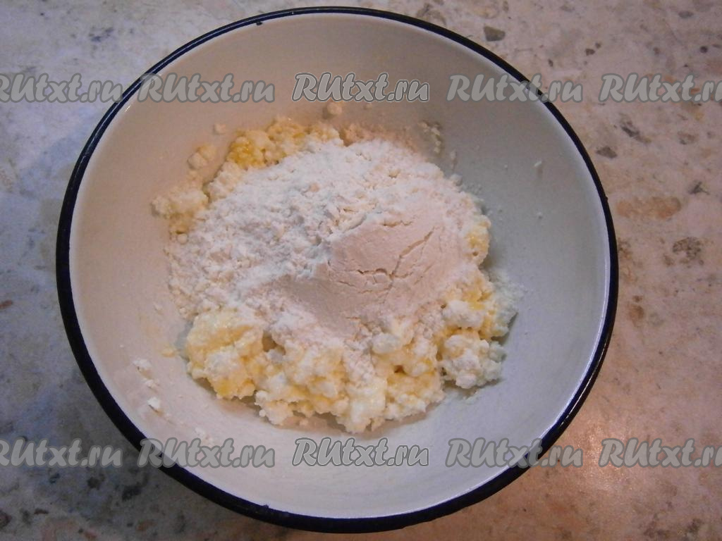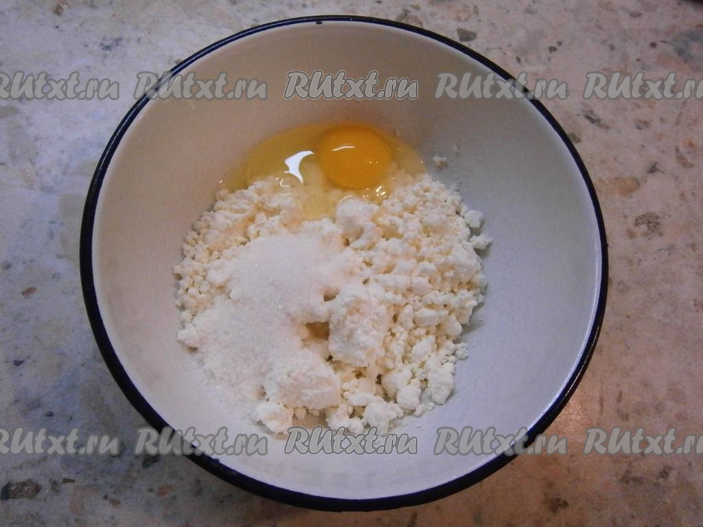 В творог (лучше взять базарный, жирненький) добавить сырое яйцо, щепотку соли, всыпать сахар.