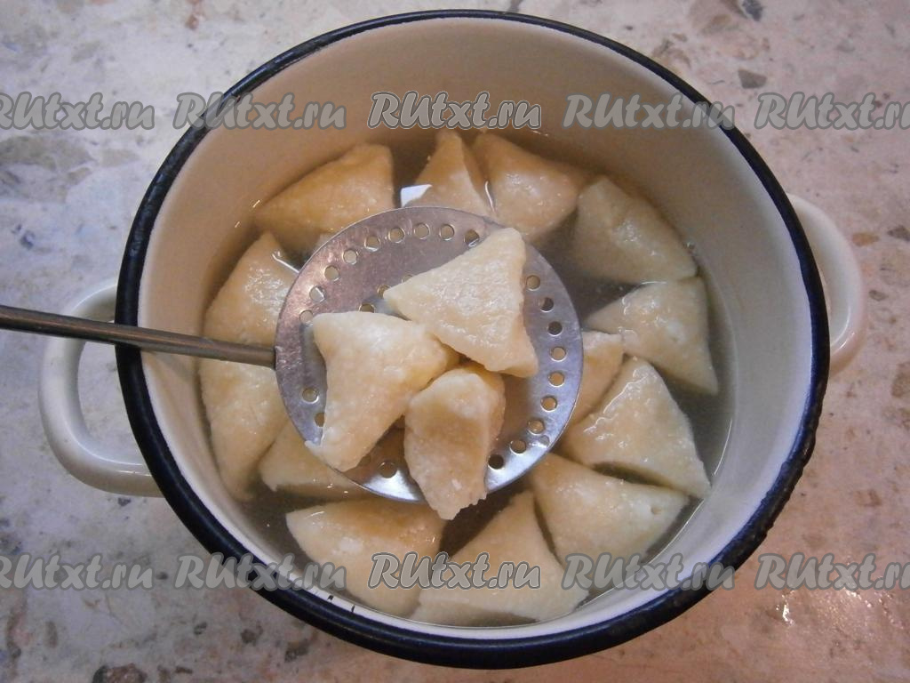 Нарезанные кусочки теста можно сразу отварить или заготовить впрок. Для того чтобы сварить ленивые творожные вареники, нужно нарезанные кусочки теста поместить в кипящую подсоленную воду и варить на небольшом огне минут 5-7 с момента закипания. Если вы хотите заготовить вареники впрок, тогда их нужно хорошо обсыпать мукой, разложить в один слой на разделочной доске и отправить в морозилку. Когда вареники полностью заморозятся, переложить их в целлофановый пакет, отправить в морозилку, а, когда потребуется приготовить вареники, отварить их в кипящей подсоленной воде в течение 5-7 минут.