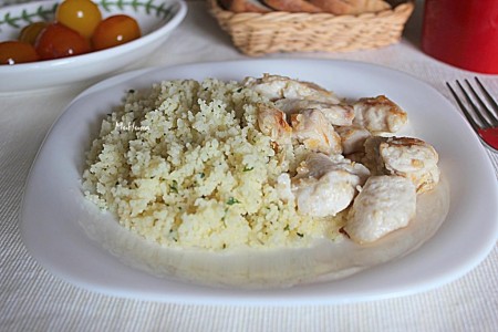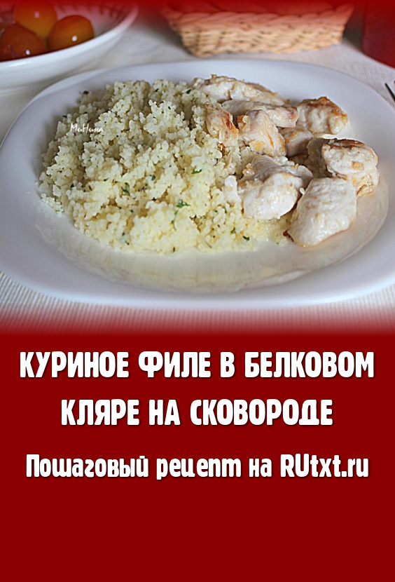 Мягкие, аппетитные, вкусные кусочки куриного филе, приготовленные в белковом кляре, разложить со сковороды по тарелкам и подать с гарниром (например, с кускусом или рисом) к столу.