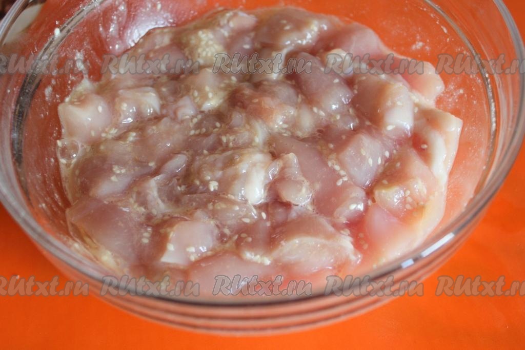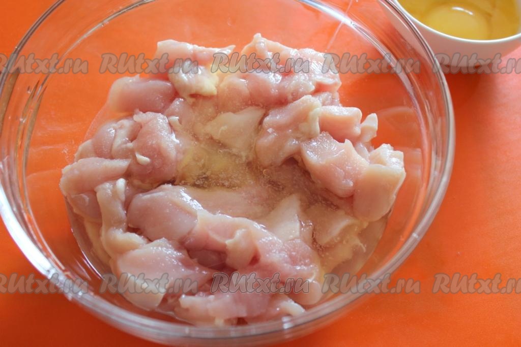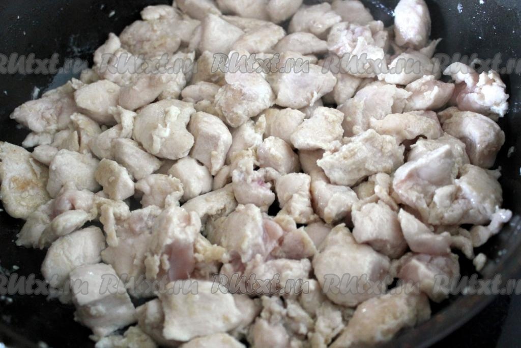 Куриное филе нарезать на небольшие кусочки (я взяла куриную грудку, отделила мясо от кости и у меня получилось 2 куриных филе, которые я и нарезала на небольшие кусочки).
