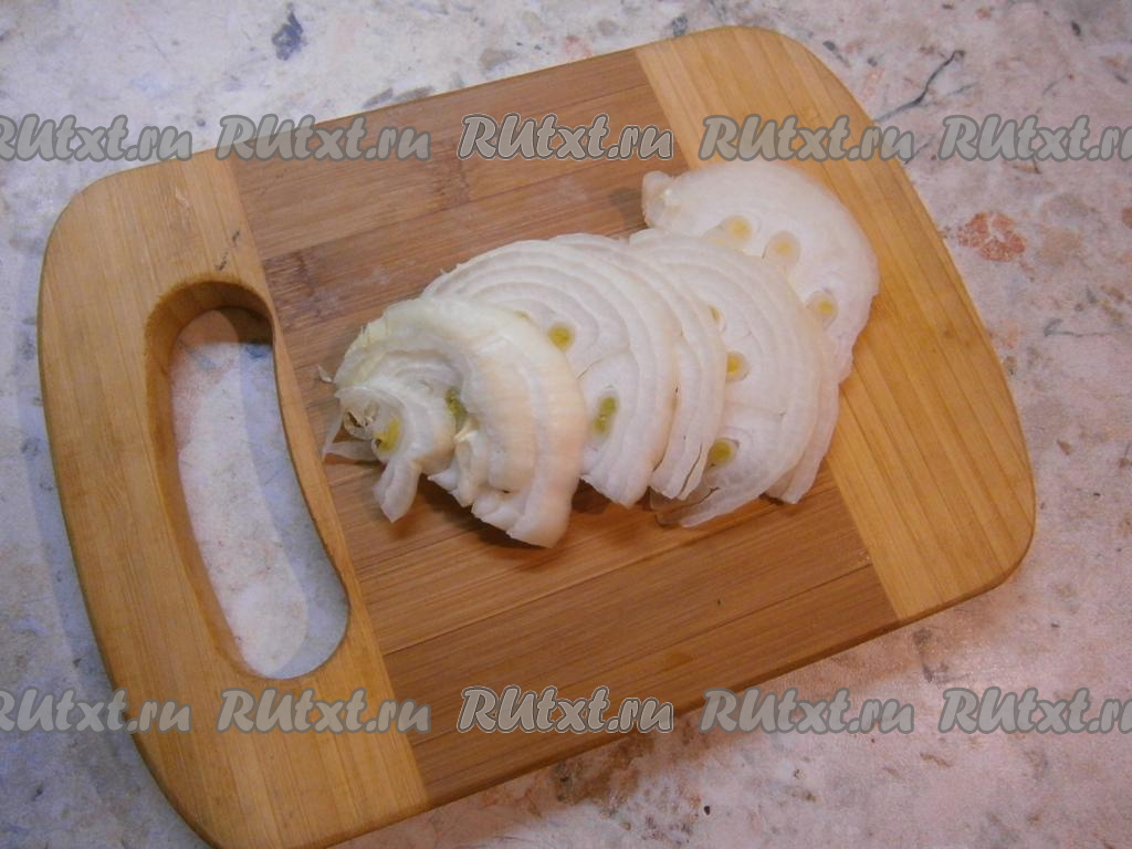 Лук очистить и нарезать тонкими кольцами или полукольцами.