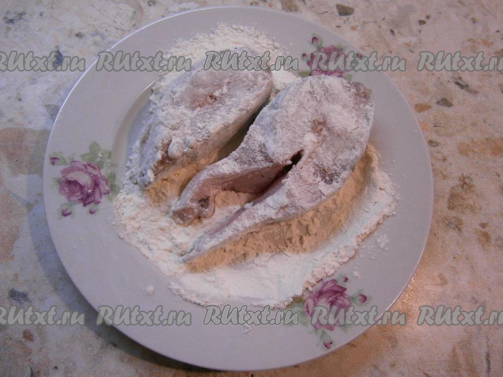 Далее рыбу немного обсушить бумажными полотенцами и обвалять каждый кусочек в муке со всех сторон.