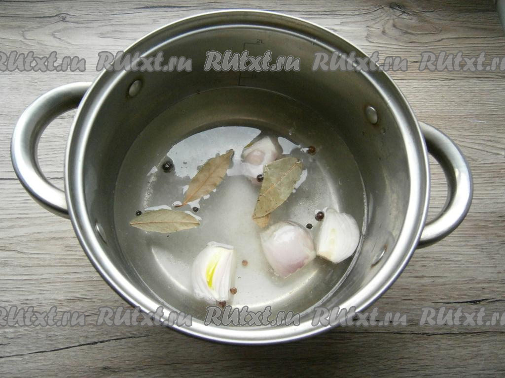 Воду довести до кипения, всыпать соль, добавить разрезанную на 4 части очищенную луковицу, лавровые листья, горошины душистого и чёрного перцев, варить рассол на медленном огне 7-8 минут под прикрытой крышкой.