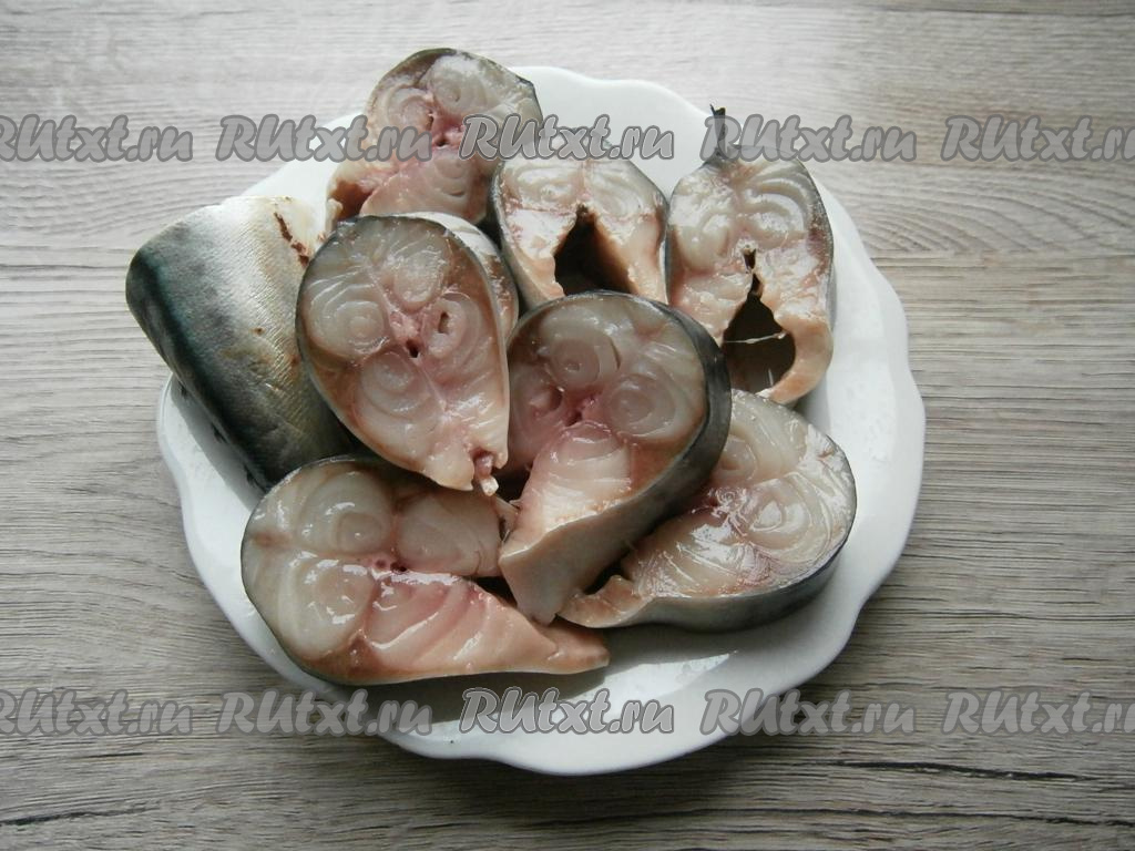 Отрезать голову и хвост, удалить внутренности, рыбу хорошо вымыть. Нарезать скумбрию на 7-8 кусочков.