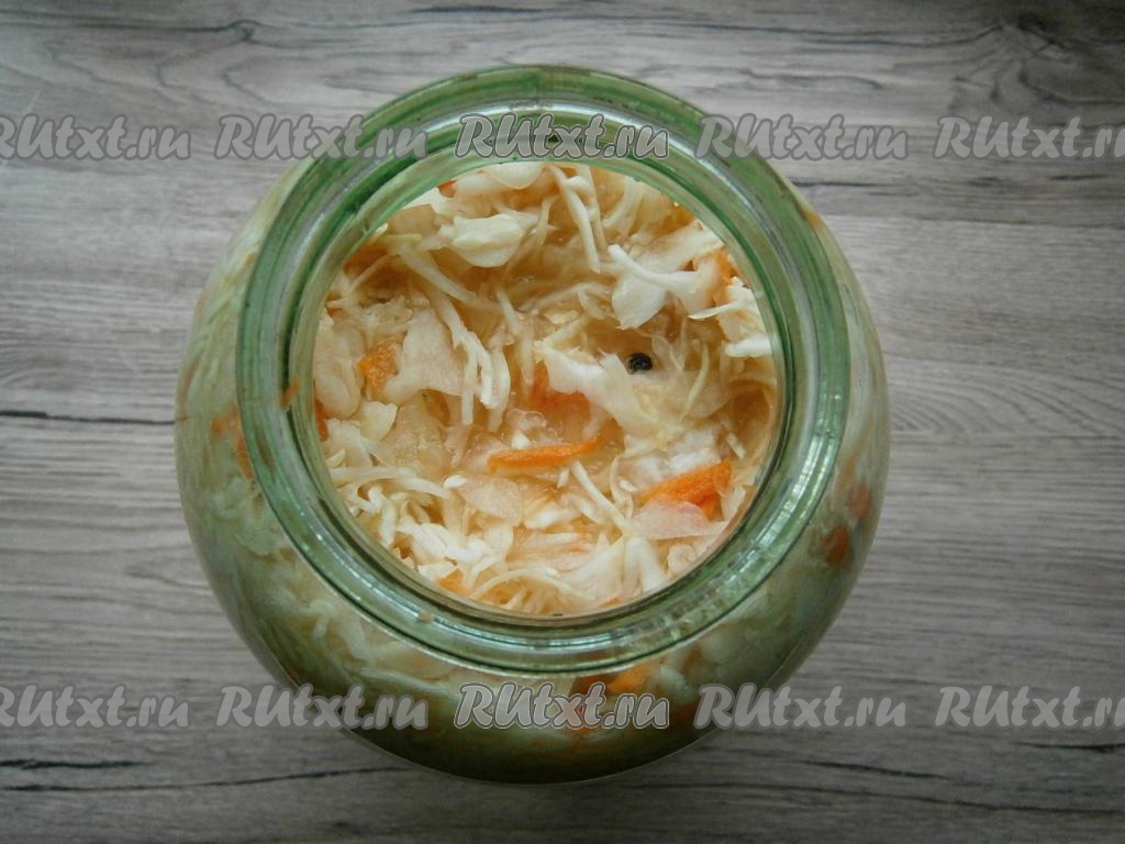 Если в комнате очень тепло, капуста у вас будет готова уже через 2 суток, пробуйте! Если кислого вкуса еще нет, оставить капусту кваситься еще на сутки. Когда вкус вас полностью удовлетворит, поместить капусту в холодильник. Подавать очень вкусную и полезную хрустящую квашеную капусту, приготовленную в банке, с луком, заправленной душистым подсолнечным маслом.