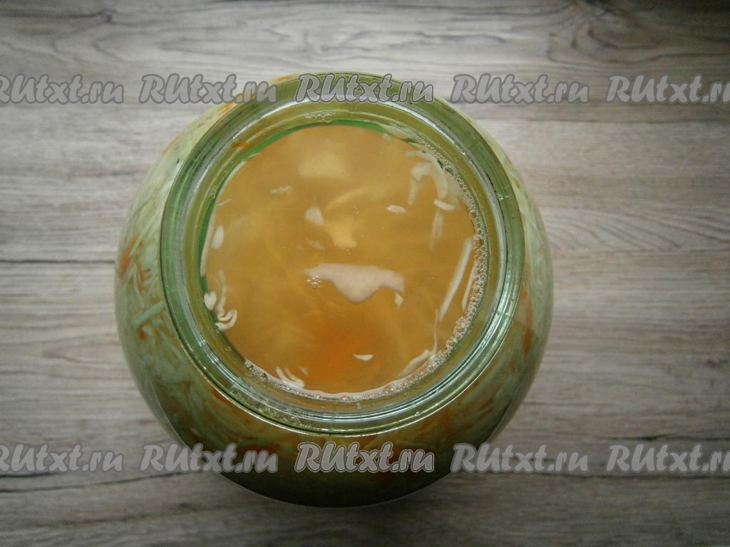 Прикрыть банку с капустой перевернутой капроновой крышкой или марлей, поставить в теплое место на 2-3 суток. Через сутки капуста начнет бродить и появится много жидкости, которая будет выливаться через край банки, поэтому банку с капустой лучше поставить в миску или тарелку, куда и будет выливаться лишний сок, выделившийся в процессе брожения (сок, вылившийся через край банки, нам в дальнейшем не понадобится).