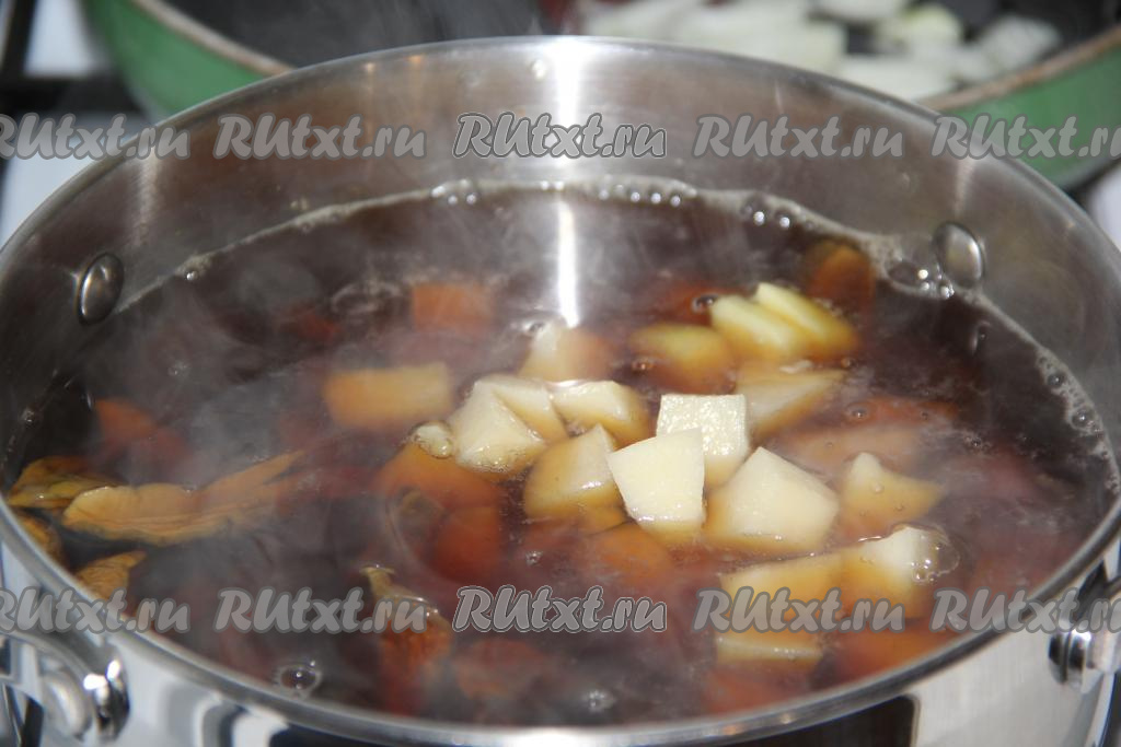 Сушеные грибы промыть под проточной водой (свежие грибы перебрать и очистить), залить холодной водой, поставить на огонь, после закипаний уменьшить огонь и варить 30 минут. С лесными (свежими, сушеными или замороженными) грибами суп получается особенно вкусным и ароматным. Если вы готовите с шампиньонами, тогда их не нужно отваривать в течение 30 минут (просто пропустите этот этап приготовления).