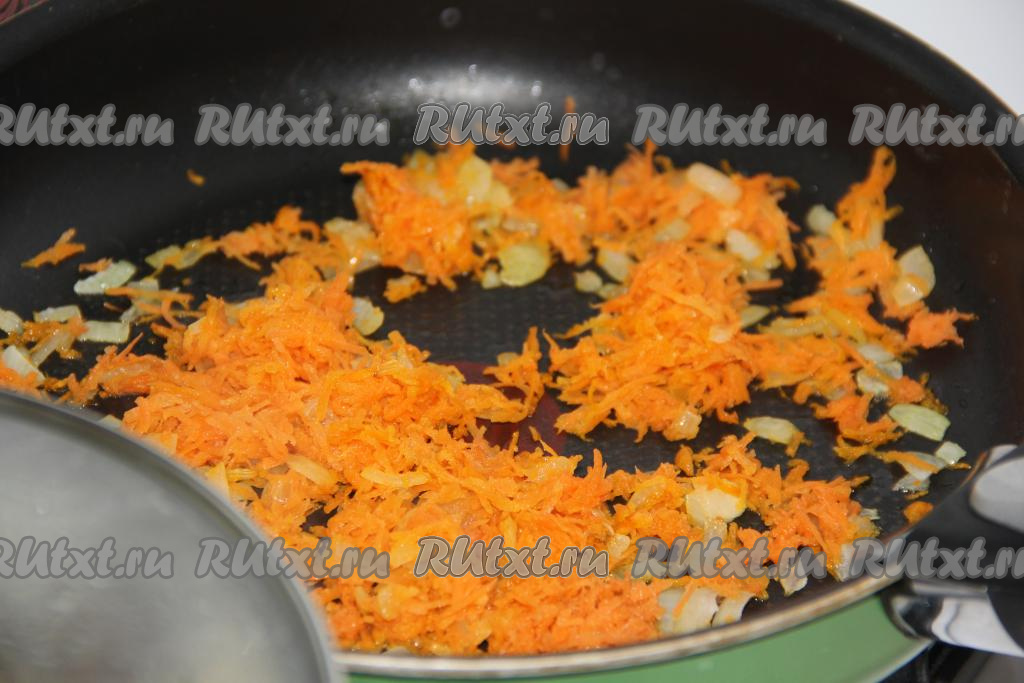 Обжарить лук с морковью на растительном масле до золотистого цвета, не забывая иногда помешивать.
