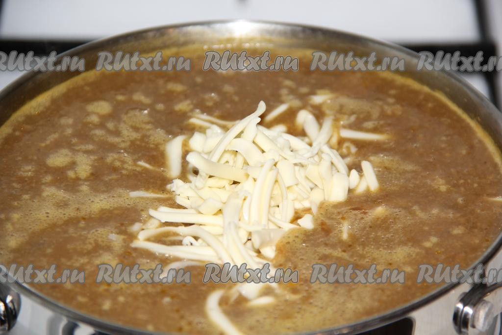 Затем с помощью погружного блендера пробить суп в пюре. Грибной суп-пюре снова поставить на огонь, добавить соль и плавленный сыр, предварительно натертый на крупной тёрке. Перемешать суп, чтобы сыр расплавился.
