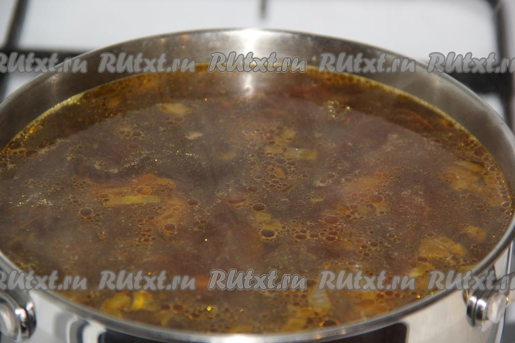 Варить суп на небольшом огне в течение 5-10 минут, затем добавить чеснок, пропущенный через пресс. Снять кастрюлю с огня и дать супу настояться под крышкой в течение 20 минут.