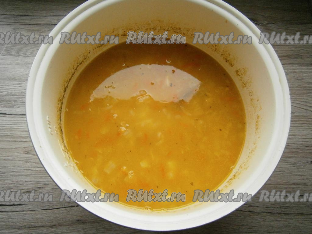 Влить в чашу горячую воду и выставить режим "Суп" на 1 час, крышку мультиварки закрыть.
