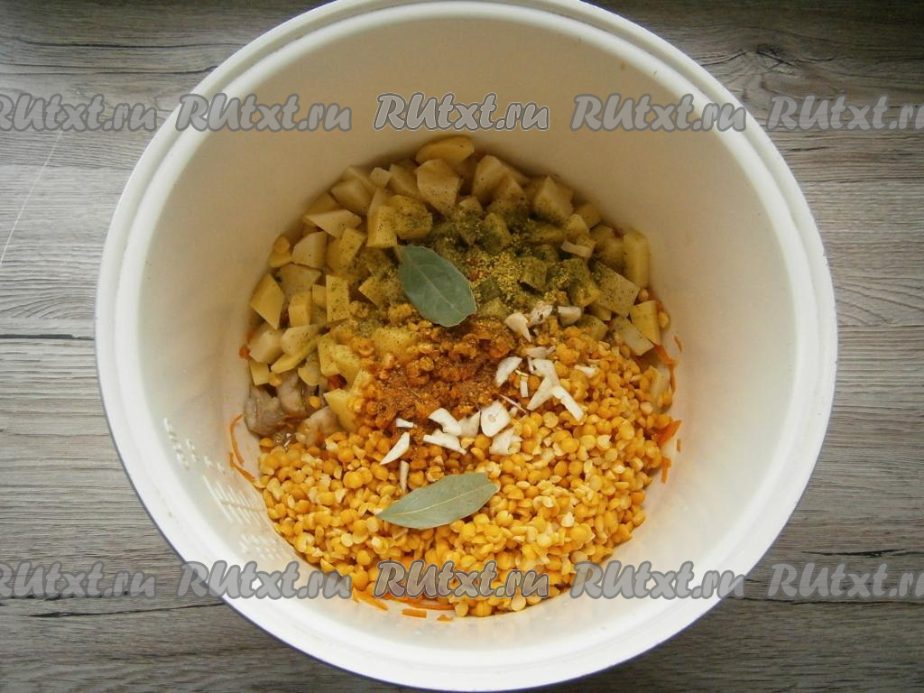 Добавить в чашу к курице и овощам горох и нарезанный кубиками картофель. Всыпать соль, специи, приправу для супа, добавить измельченный чеснок и лавровые листья.