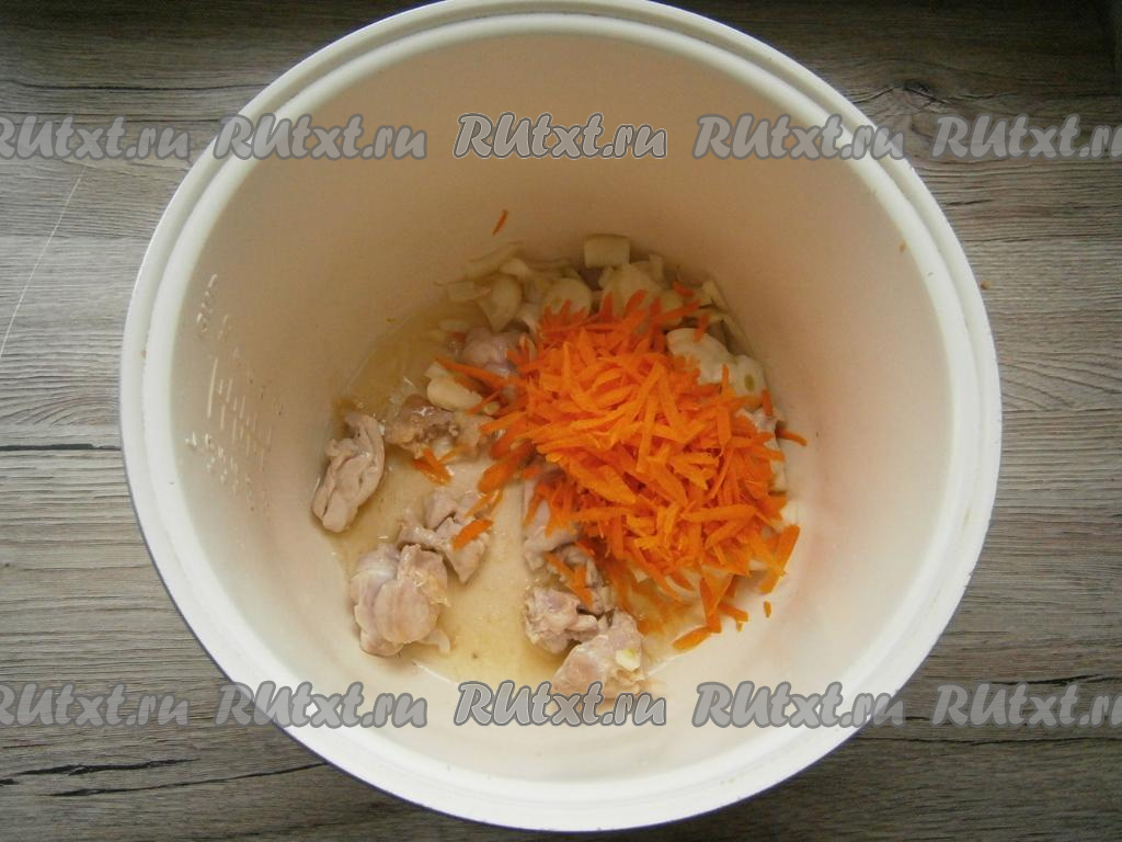 Лук, морковь, чеснок и картофель очистить. Растительное масло налить в чашу мультиварки, выложить кусочки куриного мяса, выставить режим "Выпечка" на 20 минут. Обжаривать курицу, помешивая, в течение 10 минут, после чего добавить натертую на крупной терке морковь и нарезанный репчатый лук.