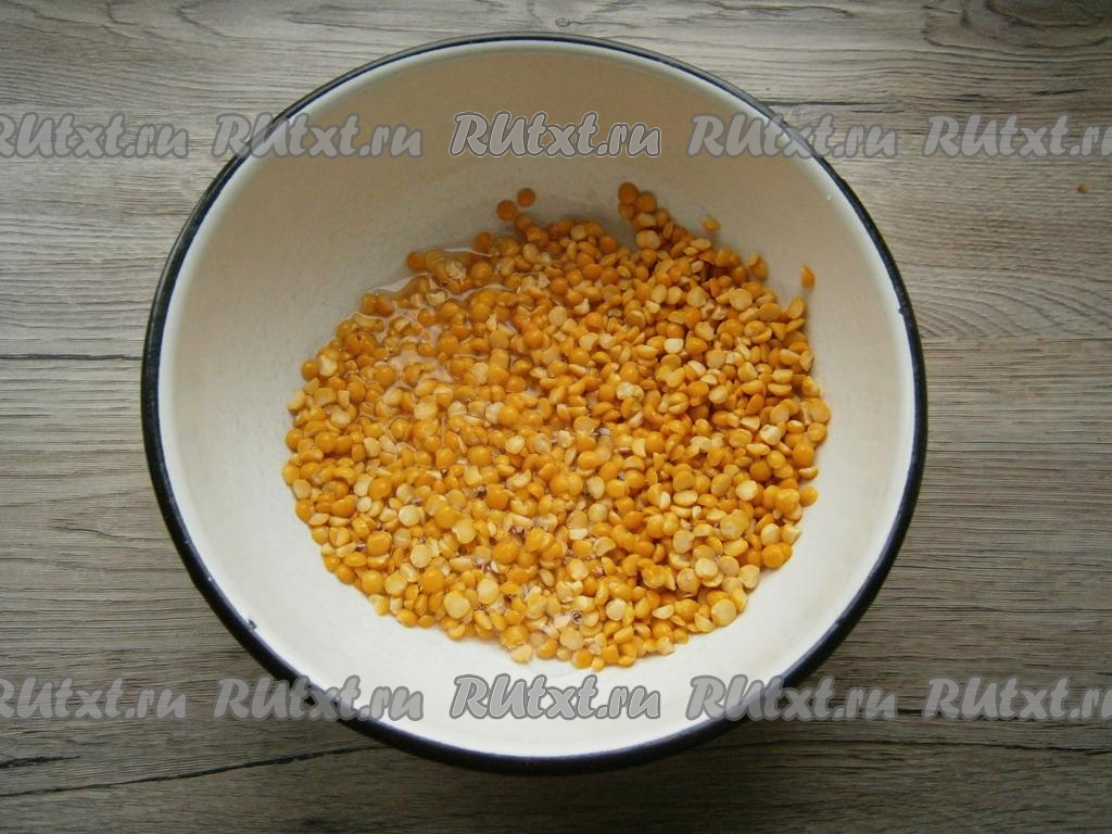 Обжаривать куриное мясо с луком и морковью, помешивая, оставшиеся 10 минут. Горох хорошенько промыть.