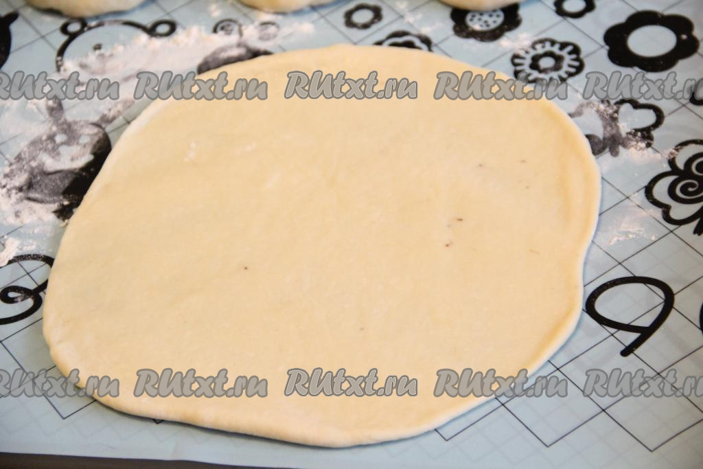 На присыпанном мукой столе (или на силиконовом коврике) раскатать каждый шарик из теста скалкой в круг (не очень тонко).