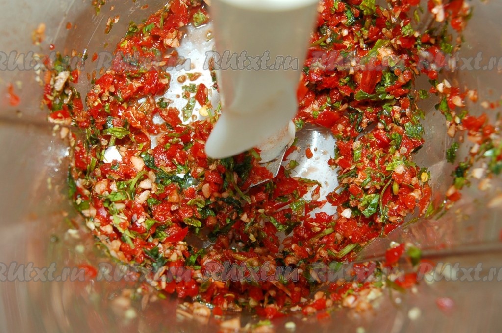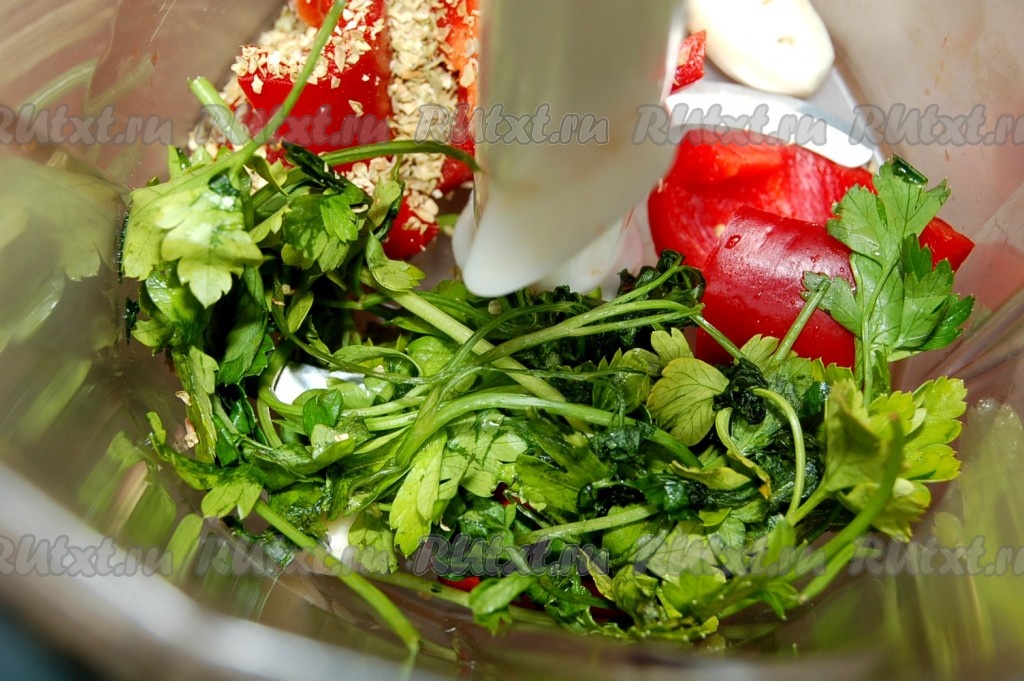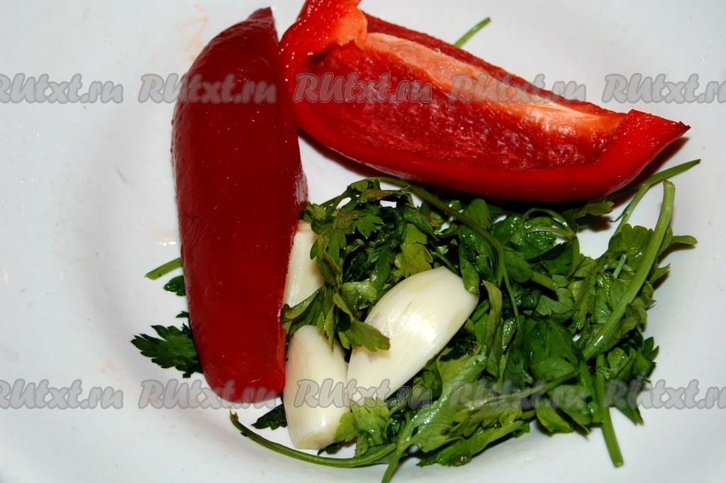 Петрушку, болгарский перец и чеснок выложить в чашу комбайна (или измельчителя), измельчить.